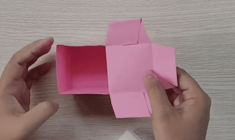 Bước 4: Chọn giấy A4 màu khác để làm nắp hoặc phần trang trí. Dán keo cố định các cạnh, thêm dây ruy băng hoặc họa tiết nhỏ để hộp thêm sinh động.