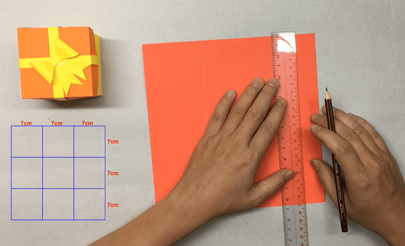 Bước 1: Dùng thước kẻ và bút chì đánh dấu trên tờ giấy A4 (kích thước 21x21cm), chia thành 9 ô vuông bằng nhau (mỗi ô 7x7cm).